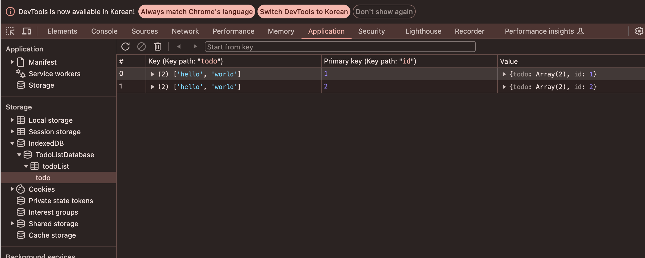 여기서 TodoListDatabase는 우리가 사용할 indexedDB의 이름이 될 것이고, ++는 autoincrement를 적용하게 한다. 이제 페이지가 처음 랜더링될 때 TodoListDatabase가 있으면 세팅을 스킵하고, 없으면 임시 데이터를 추가하는 로직을 layout.tsx에 추가해준다.