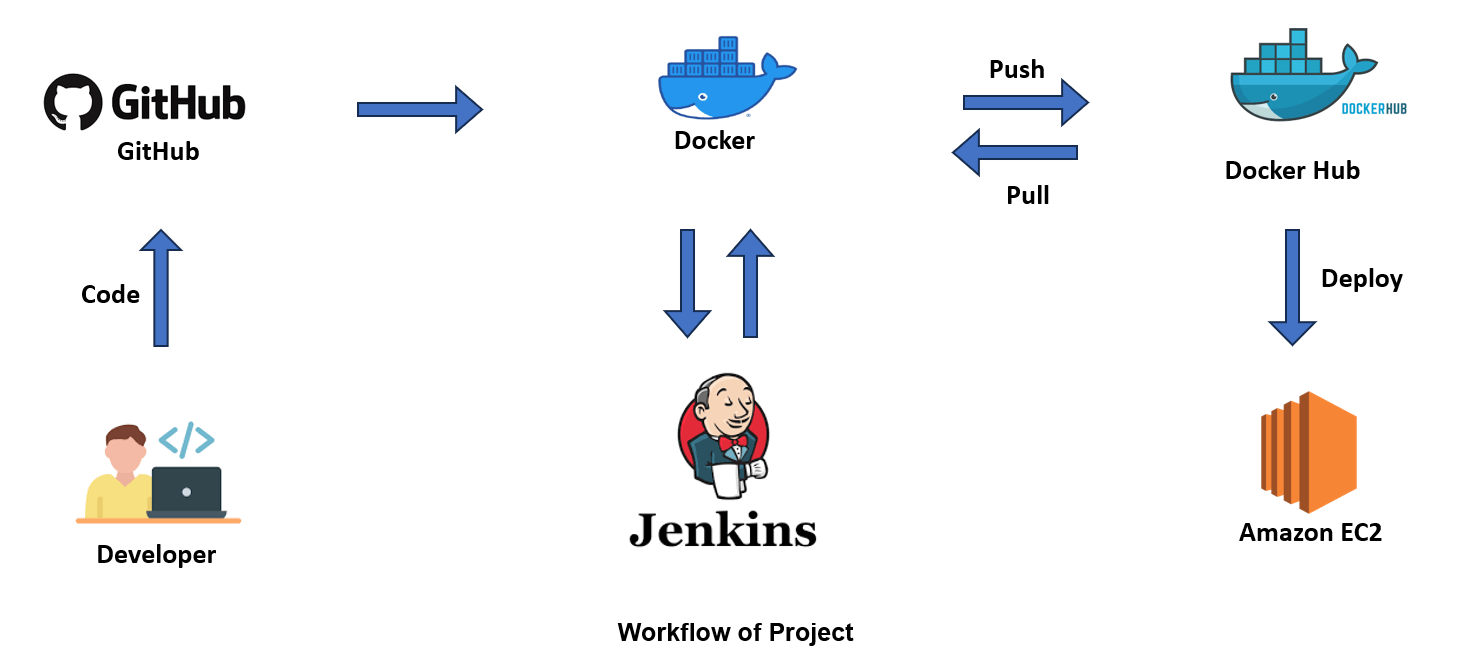 지금까지는 젠킨스가 직접 빌드와 테스트를 진행하고 빌드된 결과를 AWS에 배포하는 과정으로 동작했다. 하지만 이제 docker를 사용하게 되면서, 해당 배포를 위해 젠킨스가 docker 이미지 빌드 후 hub에 push 하면, push 된 이미지를 도커 허브에서 감지하여 aws에 이미지를 pull 받고 실행시키는 과정으로 변경된 것이다.