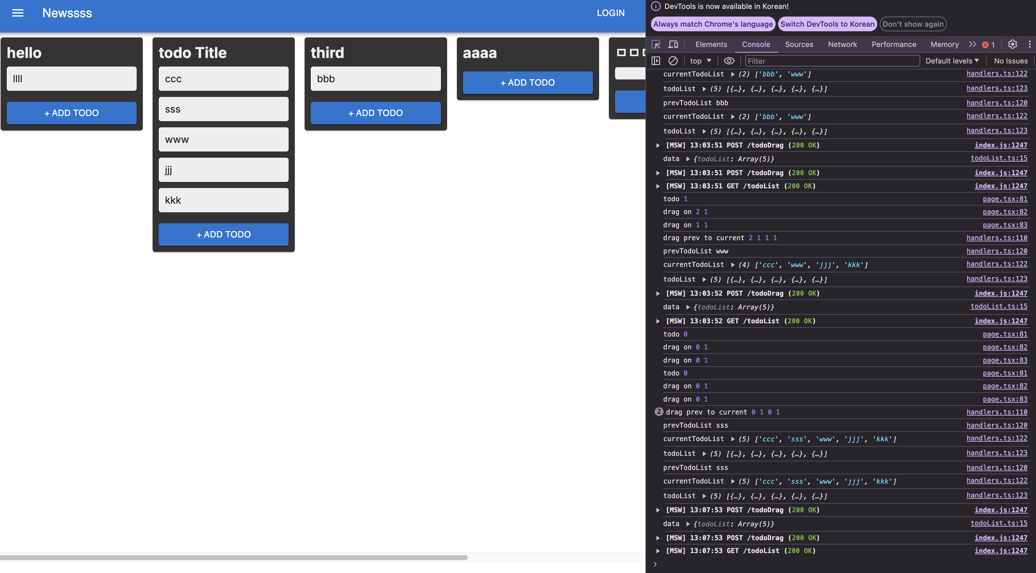 아직 mutation 함수를 만들지 않았기에, handleDropTodoOn에서는 해당 state들이 제대로 우리가 의도한 값을 출력하는지 console을 찍어보도록 했다. 이때 draggingTodoId가 null이 아닐 경우에만 동작하게 하여 list 동작과 겹치지 않도록 조건을 부여하였다. 기존에 만들었던 함수보다 몇 가지가 더 늘어난 것을 확인할 수 있을 것이다.